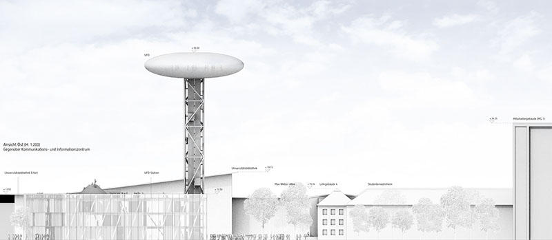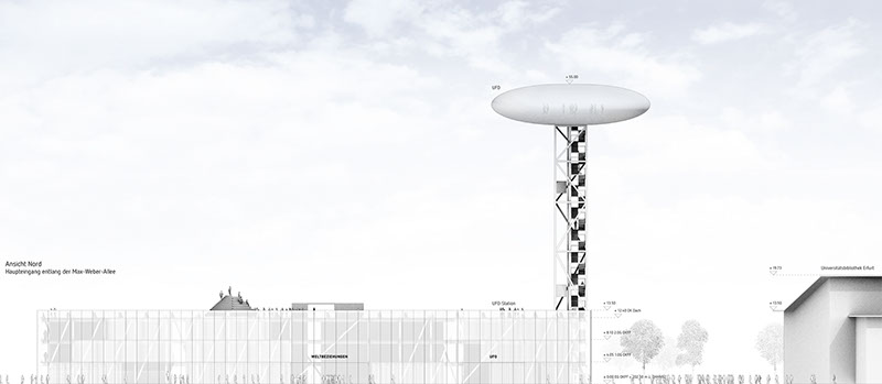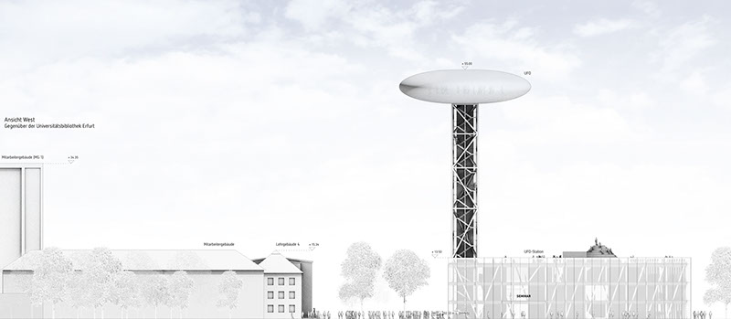UFO: Forschung widmet sich unidentifizierten Forschungsobjekten (UFOs), die sich in fremden, nahen, fernen oder künstlichen Welten finden. In Erfurt steht eine Forschungsstation, die für die Beobachtung solcher UFOs gebaut ist, aber sicher ebenso für diese anderen UFOs, diese unidentifizierten Flugobjekte der extragalaktischen Welten von denen häufig Geschichte und Geschichten mit ihren fantastischen Bildern und Texten erzählen. 55 m über der Erde zeigt sich sogar ein solches UFO, überragt die anderen Bauten und ist das sichtbare Zeichen der Universität auf der Sichtachse vom und zum Stadtzentrum.