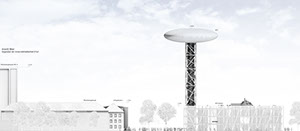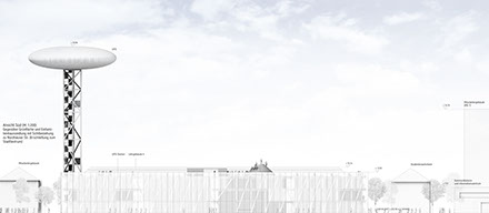 Leitidee: Eine Forschungsstation mit UFO als gestapelte Stadt (im Haus) in der Stadt, mit viel Grün zur Beobachtung merkwürdiger Welten.