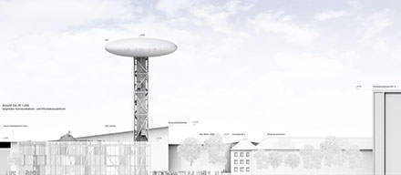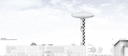 Leitidee: Eine Forschungsstation mit UFO als gestapelte Stadt (im Haus) in der Stadt, mit viel Grün zur Beobachtung merkwürdiger Welten.